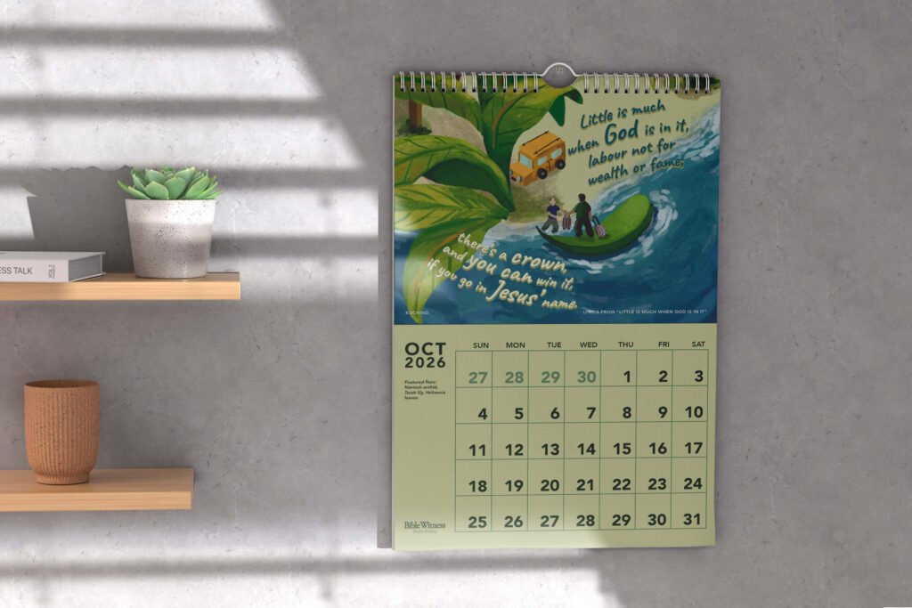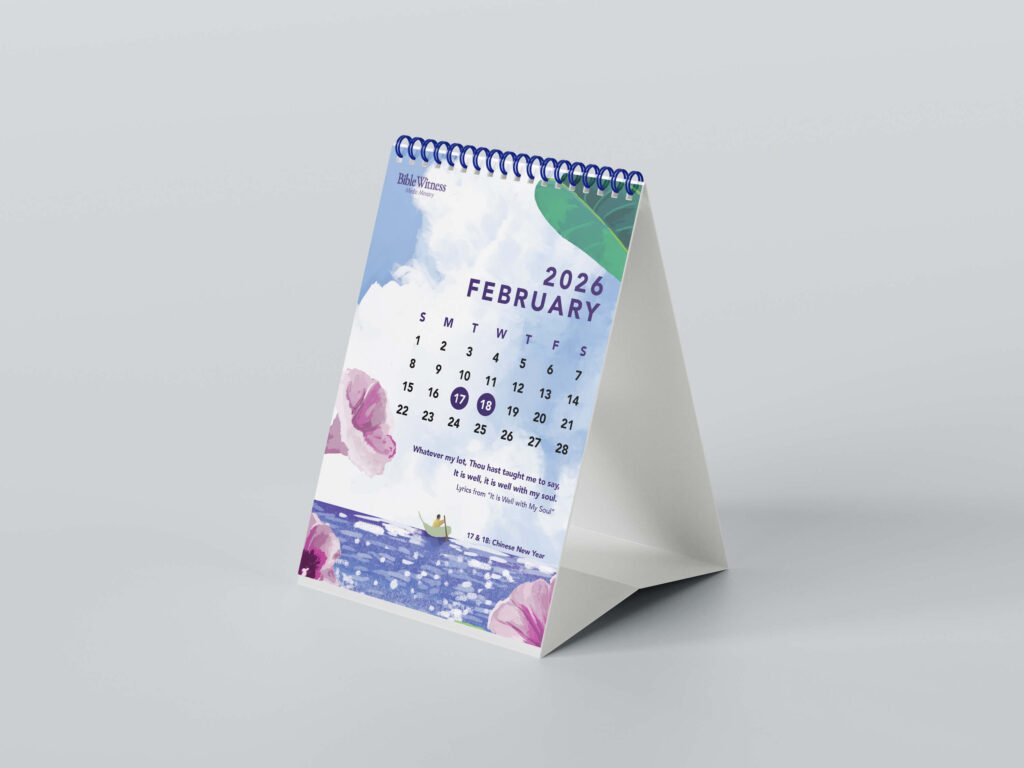 This calendar presents original digital paintings of the colours, blossoms, and landscapes surrounding our mission works far and near, inviting quiet reflection on God’s handiwork in those places. Each page also features lines from hymns and spiritual songs for the edification of souls. The artworks are painted by Clara Cho, a member of Gethsemane Bible-Presbyterian Church.